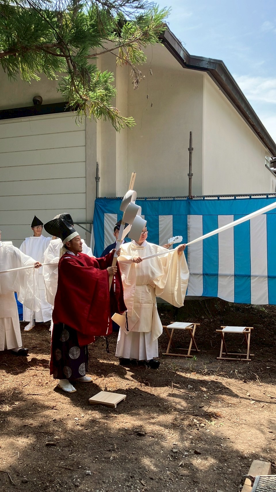 狩衣(かりぎぬ)、直垂(ひたたれ)素襖(すおう)の装束に身を纏、「曳綱の儀」「槌打ちの儀」を古式にのっとた建築儀礼を行い、建物の長久を祈りました。